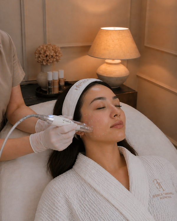 RF Microneedling is an advanced skin rejuvenation treatment offered at Jessica Tanswell Aesthetics, combining traditional microneedling with radiofrequency energy to stimulate deep collagen and elastin production. This powerful treatment targets concerns such as fine lines, skin laxity, acne scarring, enlarged pores, and uneven texture, working beneath the surface to firm, tighten, and smooth the skin. By delivering controlled heat into the deeper layers of the skin, RF Microneedling enhances skin structure and promotes long-term regeneration, making it ideal for both the face and body, including areas such as the neck, jawline, and stomach. Each treatment is tailored to your skin, ensuring safe, effective results with minimal downtime and a visibly smoother, more lifted, and refined complexion over time